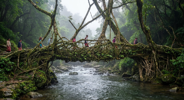 Over decades, locals have trained the roots of rubber trees to grow across rivers, creating natural bridges that get stronger with age.